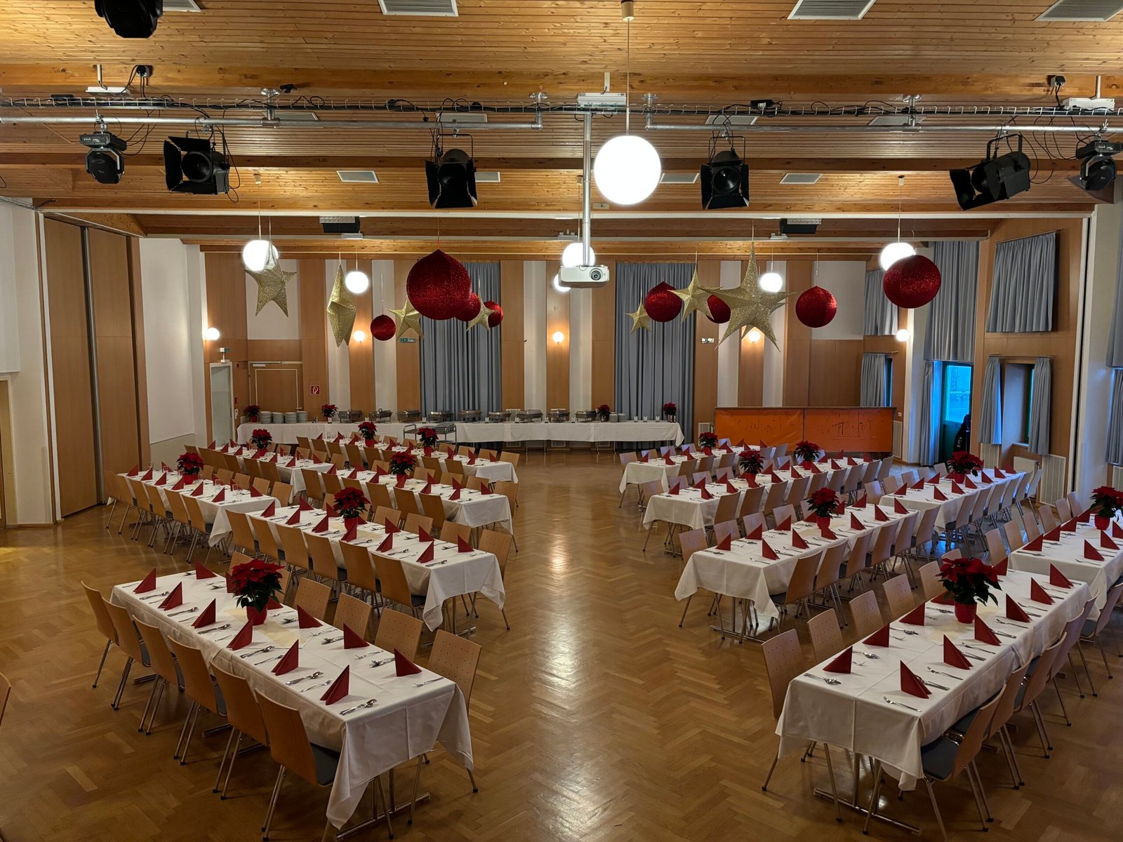 Beide Säle können je nach Veranstaltung unterschiedlich bestuhlt oder komplett frei genutzt werden. Wir kümmern uns um Aufbau, Umbau und die passende Raumgestaltung.